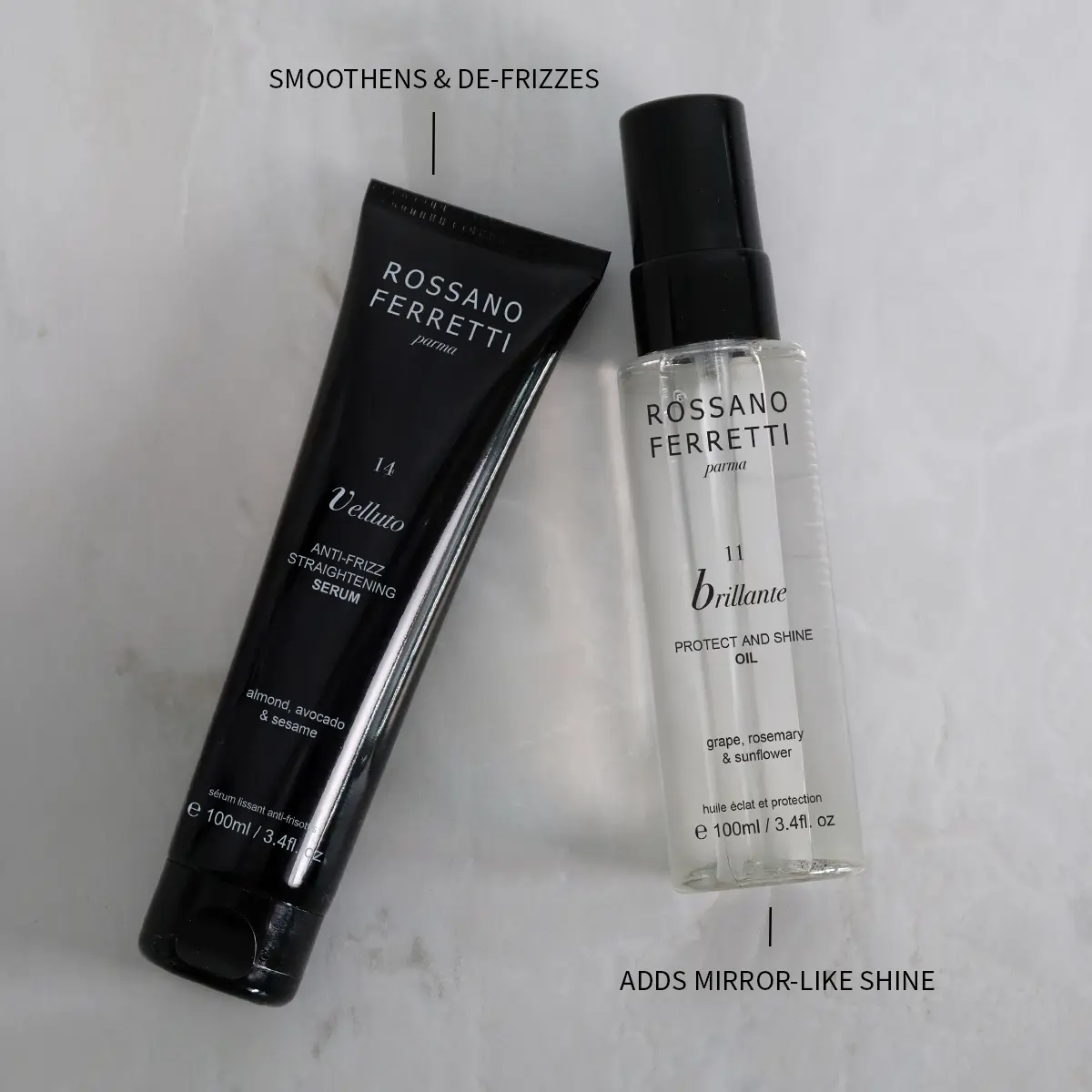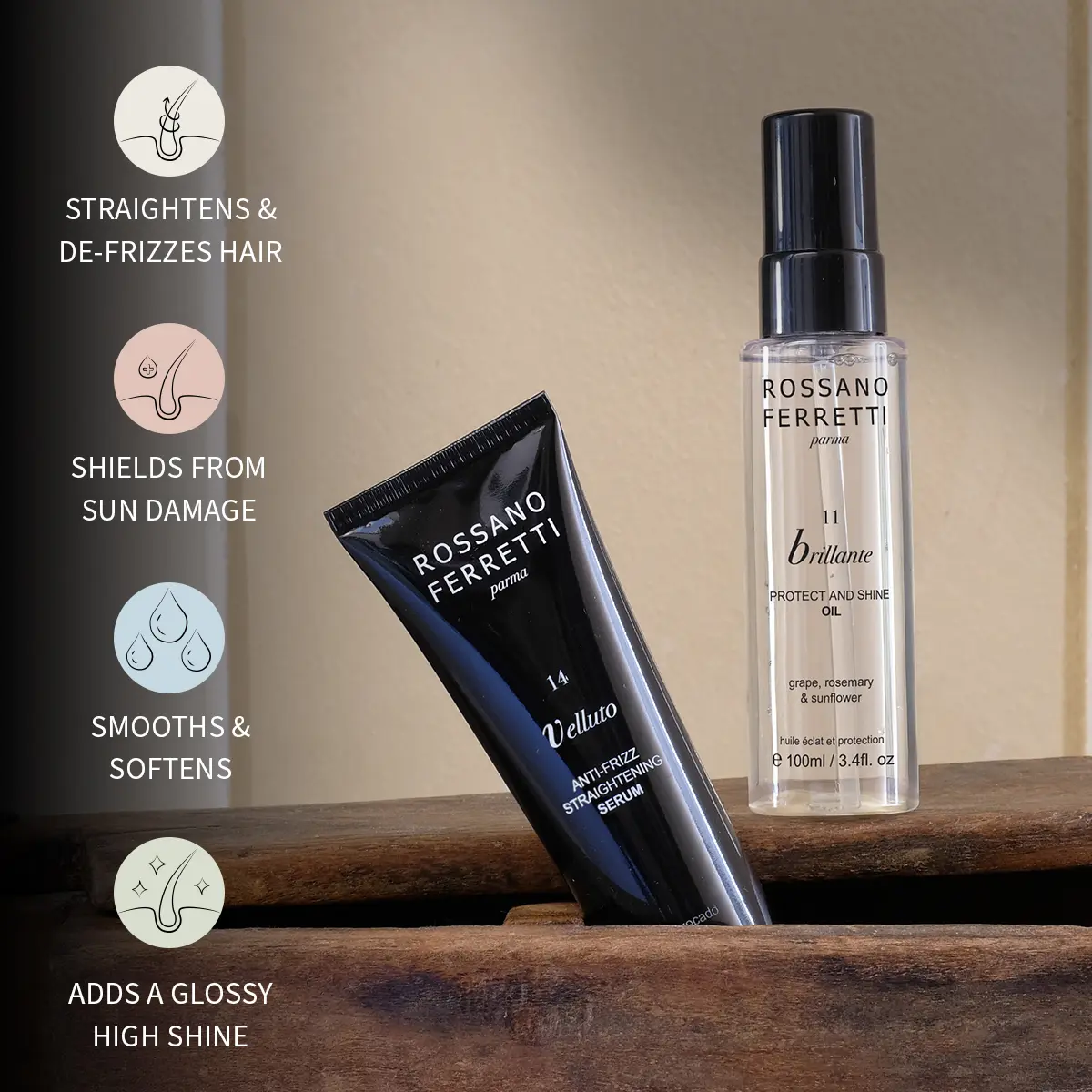 Achieve radiant, straighter looking hair with the Sleek, Straight & Shine Bundle. Features the iconic Velluto Straightening Serum, designed to hydrate, detangle and defrizz, resulting in natural-looking smooth and straight hair. Seal the sleekness with the Brillante Protect & Shine Oil, a hydrating finishing oil that offers a lustrous shine while shielding against sun exposure.