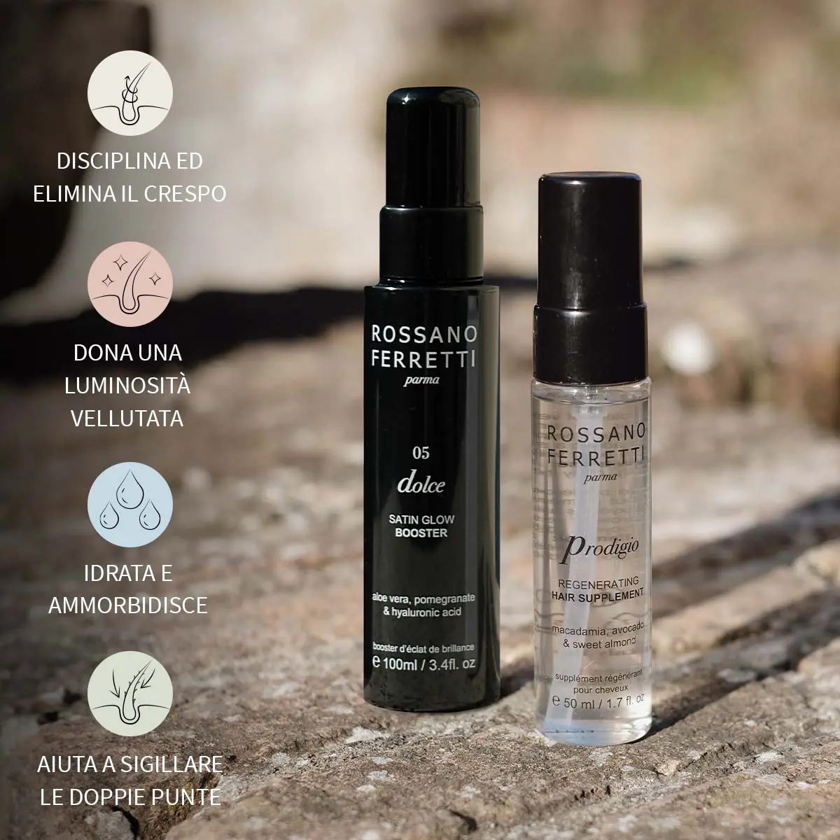 Regala la bellezza di capelli sempre perfetti con il nostro Kit Styling per la Piega. Ricco di ingredienti di derivazione naturale come Aloe Vera, Avocado e Rosmarino, questo pluripremiato set include lo Spray Idratazione e Luminosità Dolce, per controllare il crespo e dare lucentezza, e l’Olio Ristrutturante Prodigio per riparare i capelli danneggiati.