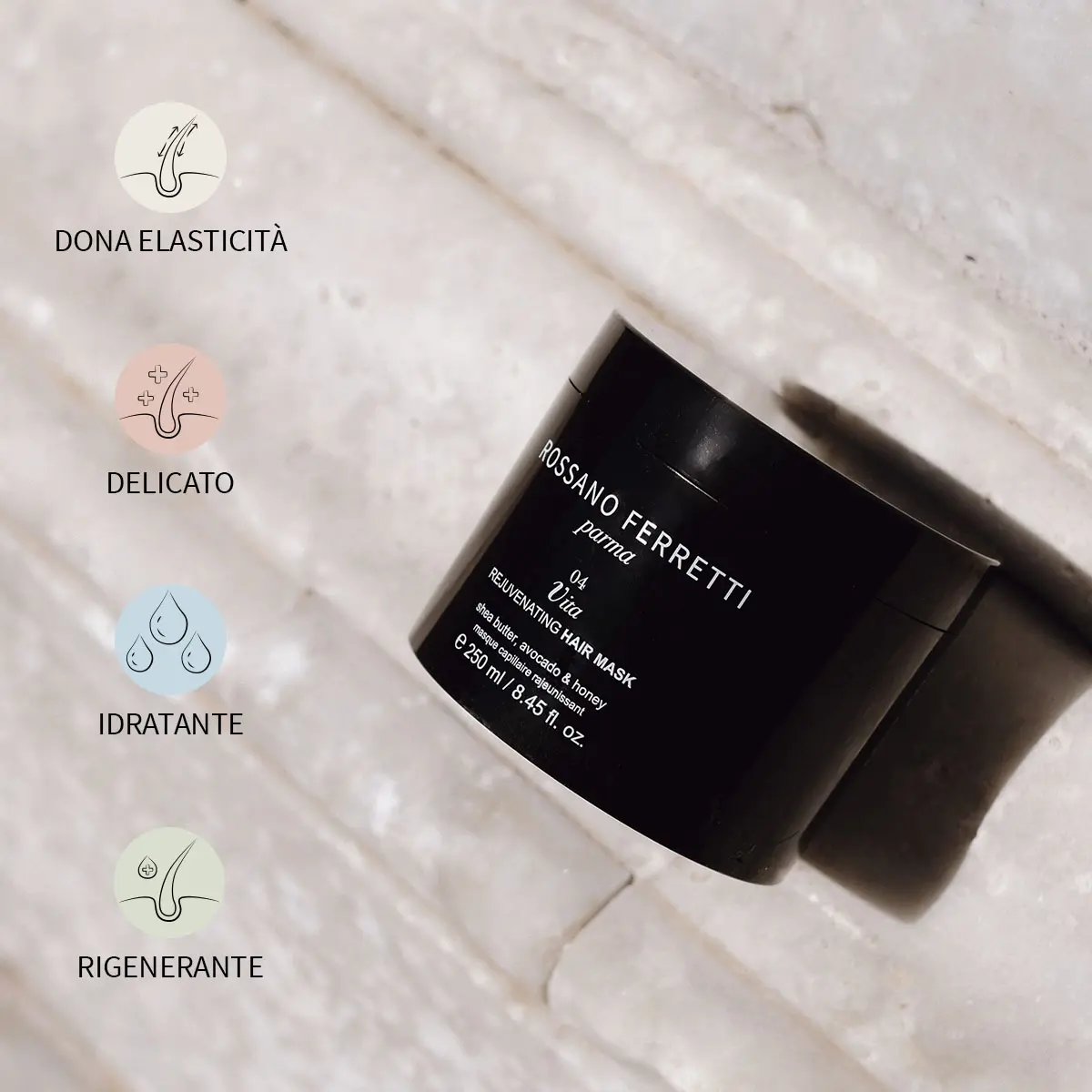 Idrata e dona vitalità ai capelli fragili, impoveriti o grigi e ripristina il loro equilibrio, rendendoli più elastici e morbidi.