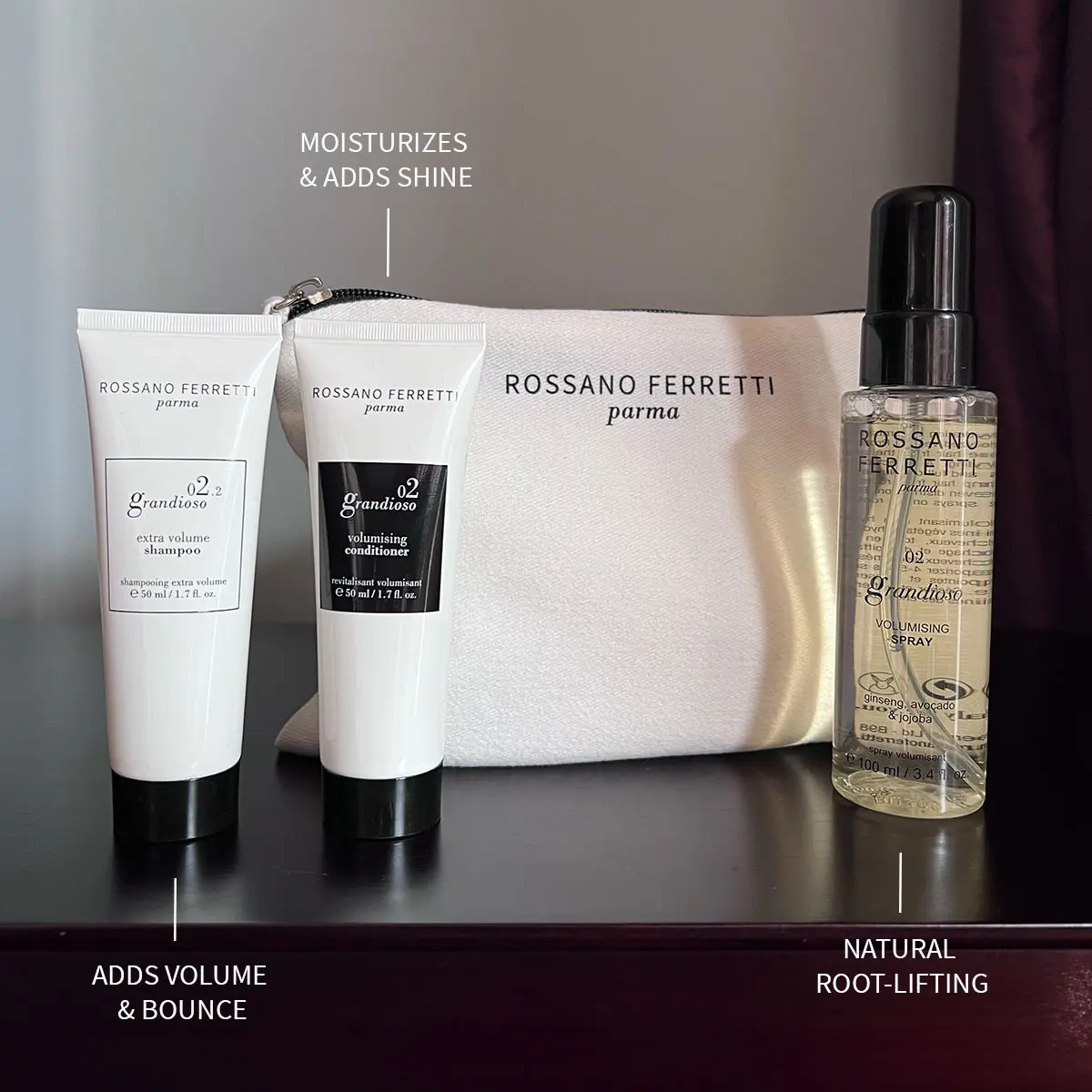 Give fine, flat or limp hair an extra volume boost with the complete travel-size Grandioso routine & receive a free beauty bag! Designed to add extra body and bounce while lifting hair from the roots, the volumizing formula contains up to 95% naturally derived ingredients and certified botanicals, like Avocado, Almond and Ginseng, to add shine & support fuller, healthier hair.