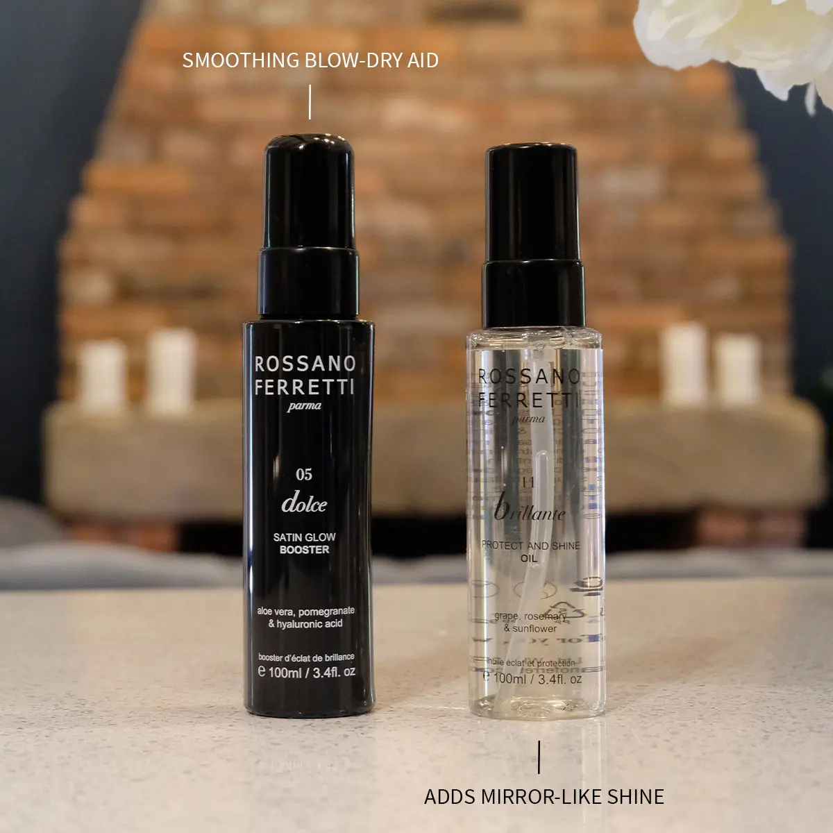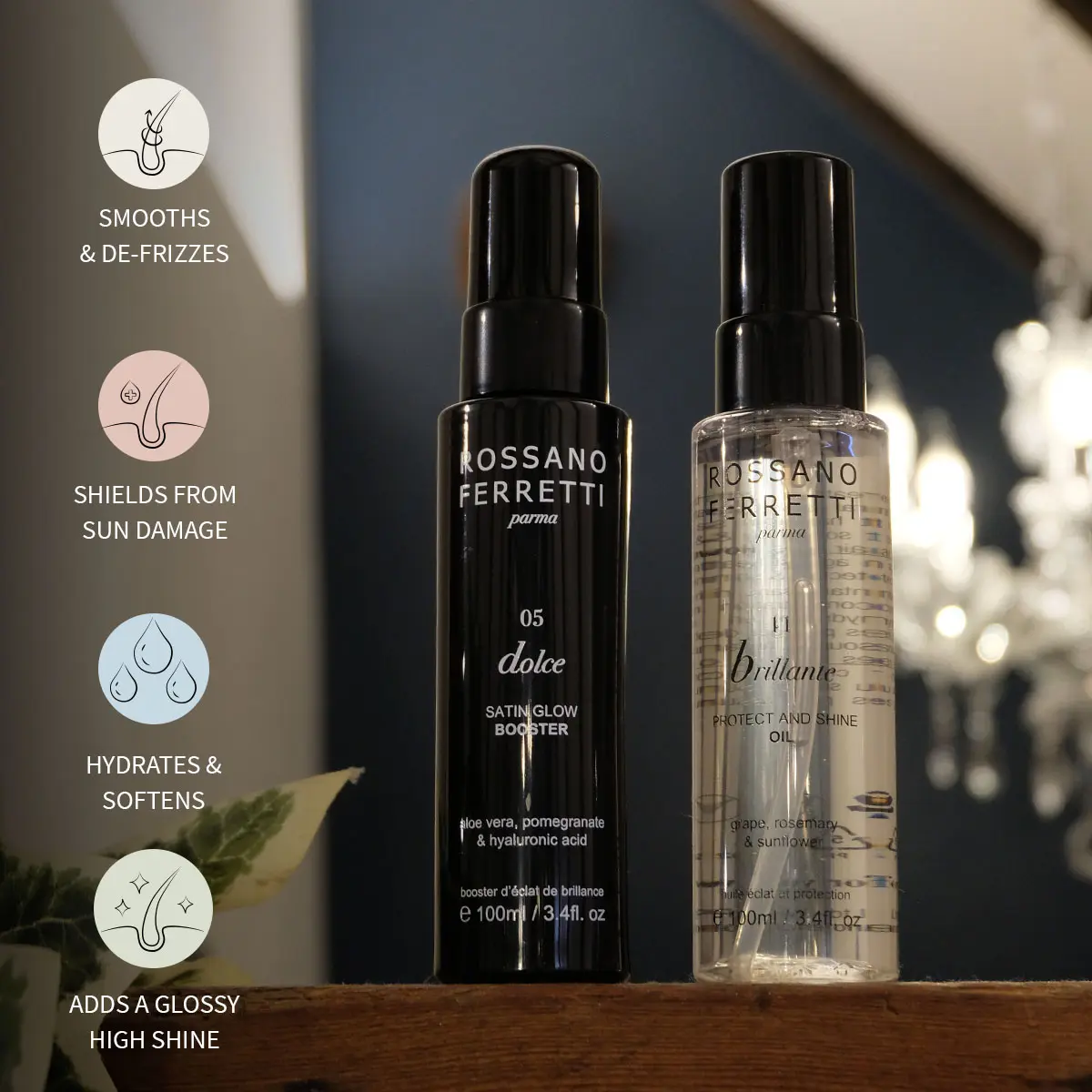 Experience unmatched radiance with the Glossy High Shine Bundle. Features the award-winning Dolce Satin Glow Booster, a hydrating blow-dry spray that combats frizz, enhances hair strength, and imparts a velvety sheen. Complementing this is the Brillante Protect & Shine Oil, a lightweight oil that adds a glossy finish and essential sun protection.